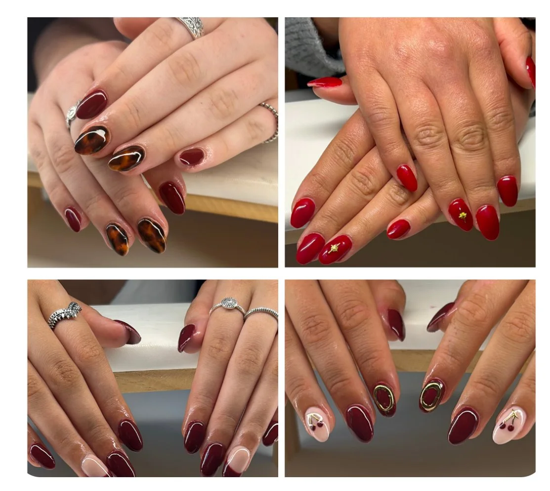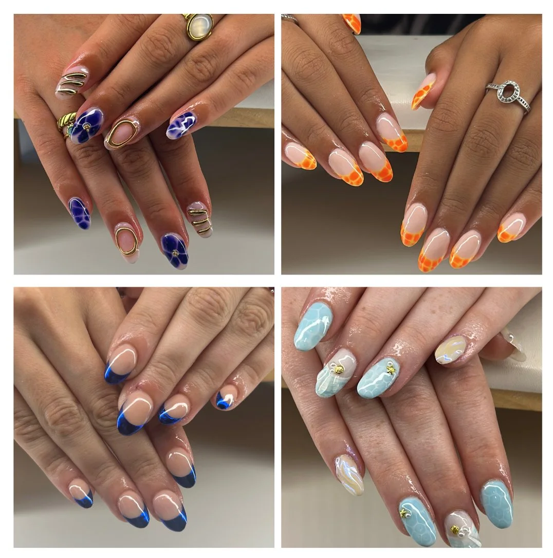 Including French tips, different colour polishes, chrome, animal print, hearts, flowers, charms, abstract art, chrome, blooming gel, 3D flowers, 3D gel, aura, encapsulation, ombré, abstract art, hand drawn art.