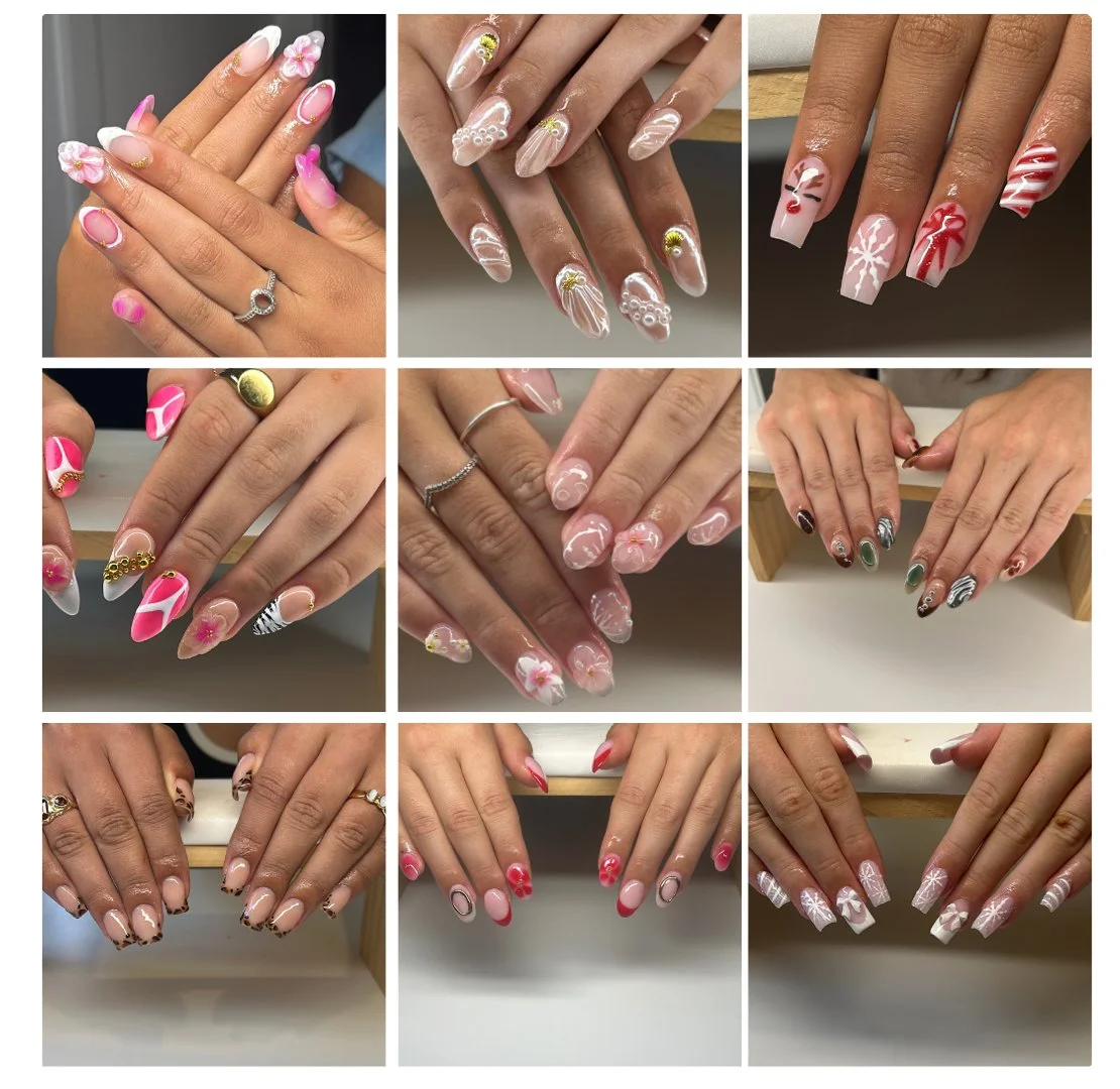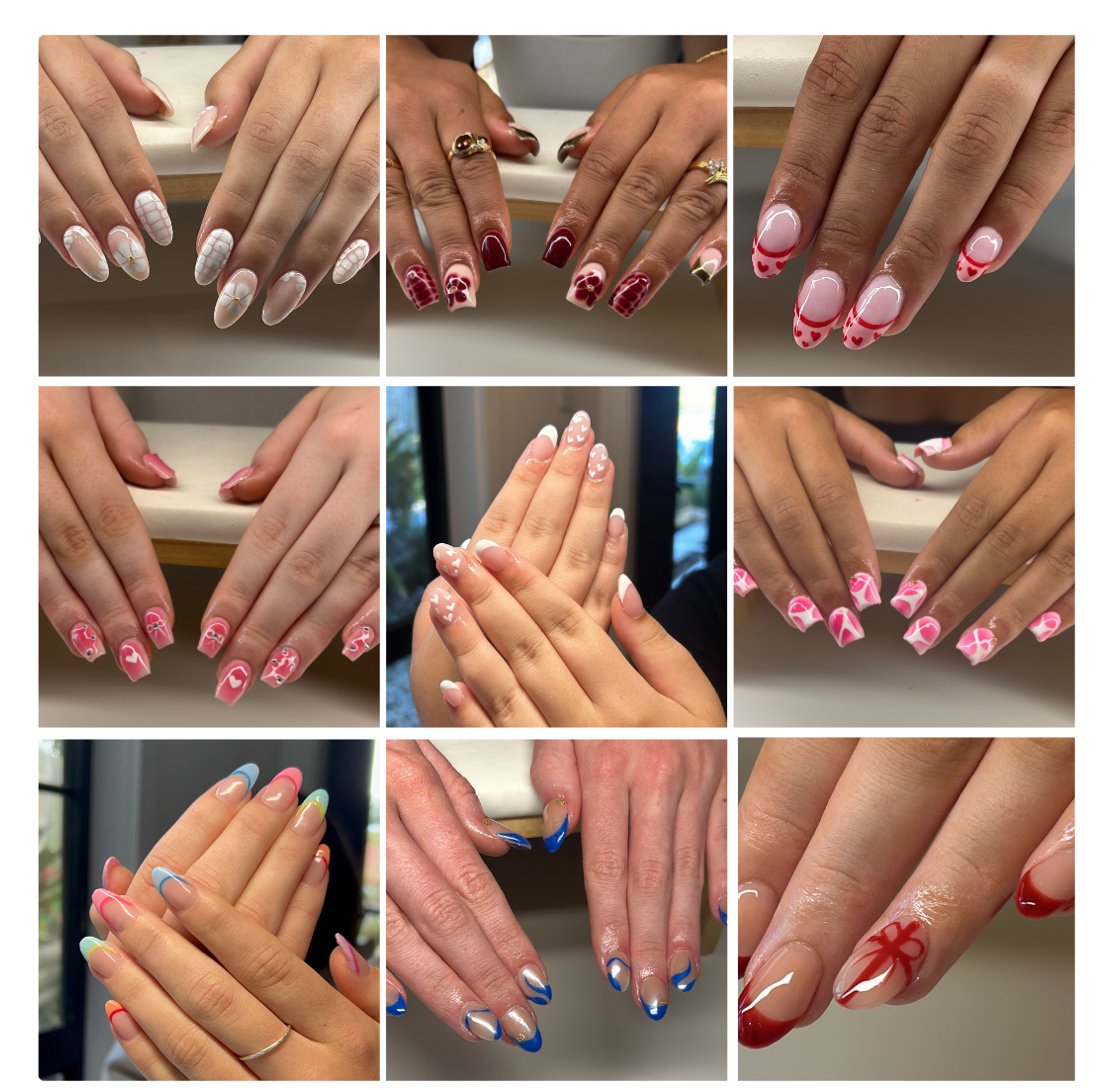 Includes designs on 6-10 fingers such as: French tips, different colour polishes, chrome, animal print, hearts, hand drawn flowers, charms, chrome, blooming gel.